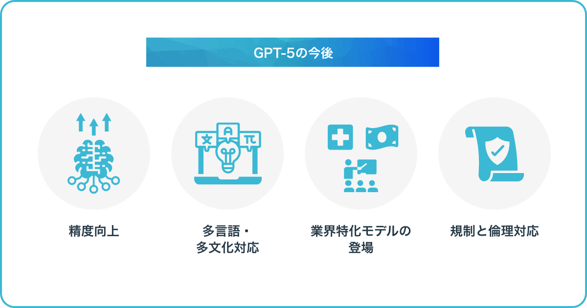 GPT-5は、今後さらに進化し、社会やビジネスの幅広い領域で中心的な役割を担うと期待されています。AI研究の加速と企業での導入拡大により、GPT-5は性能・信頼性・応用範囲のすべてにおいて成長していくと考えられるからです。