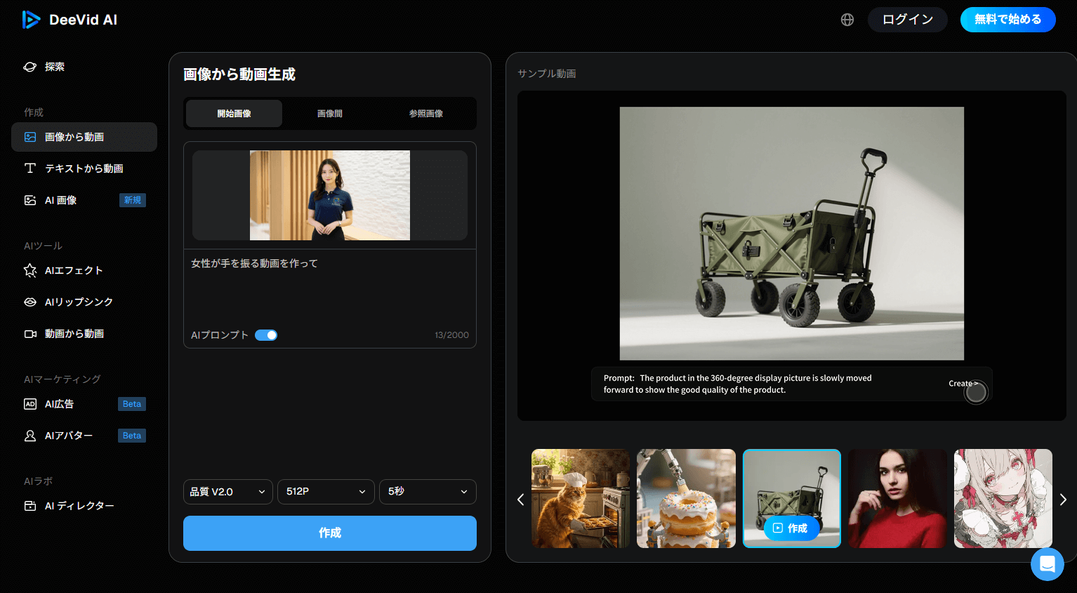 • 画像から動画を生成(Image to Video):静止画をアップロードし、その画像を基に動きのあるアニメーション動画を作成していました。