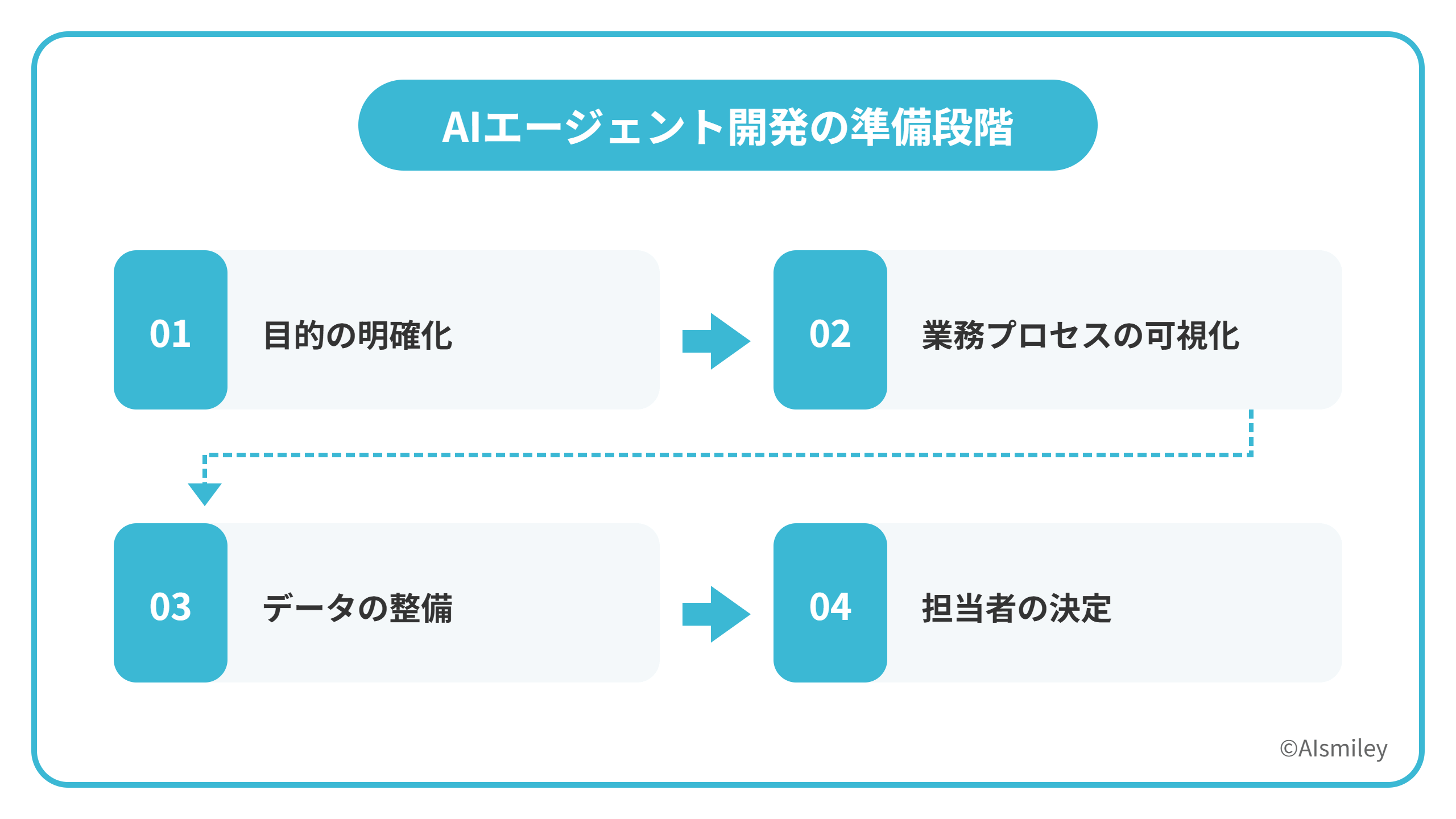 AIエージェントの導入を成功させるためには、開発前の準備が極めて重要です。準備不足のまま構築に進んでしまうと、導入後に「期待した効果が出ない」「業務に合わない」といった問題が発生する可能性が高まります。