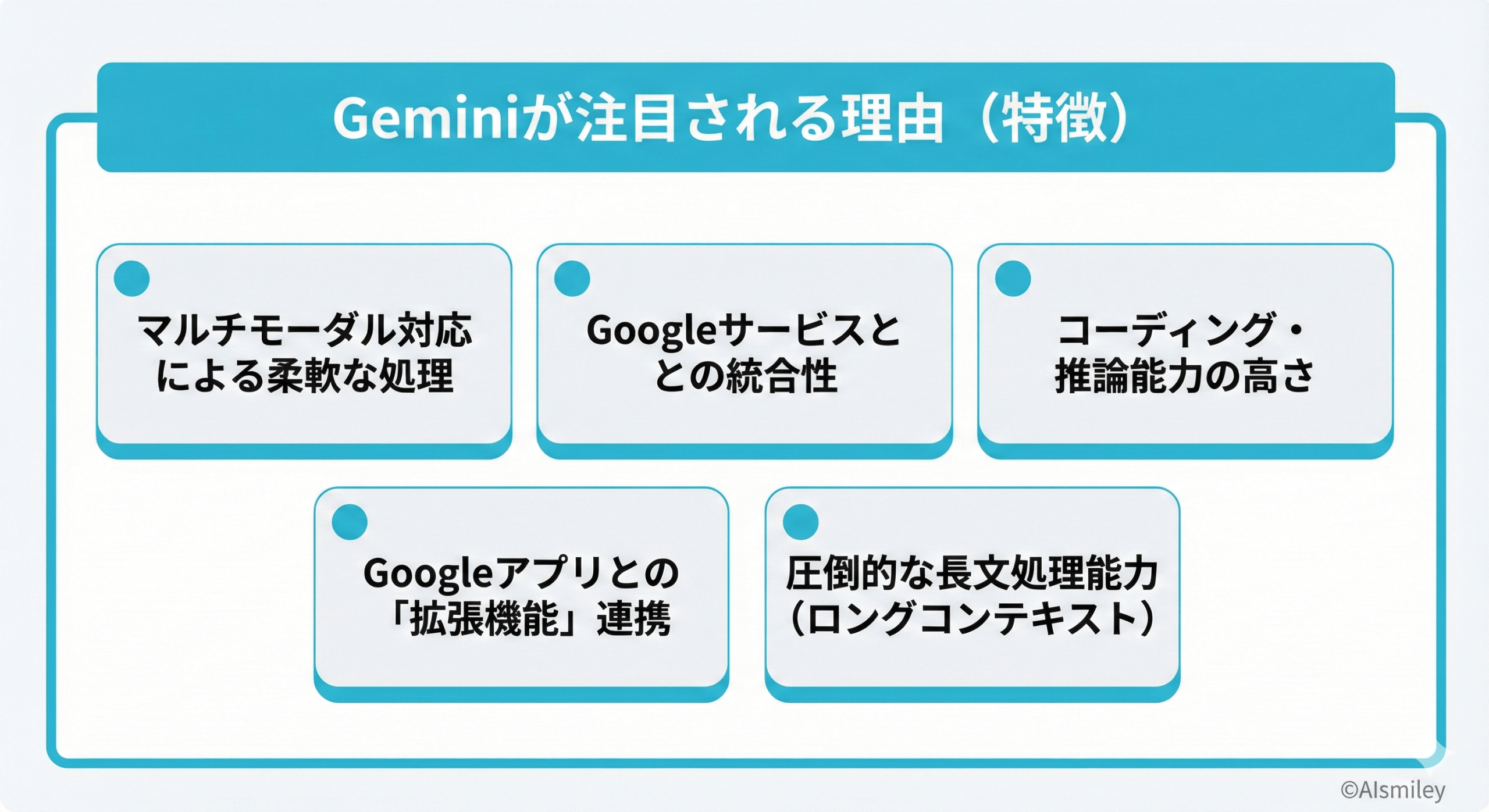Geminiは、注目されるべき特徴があります。その特徴について解説しましょう。