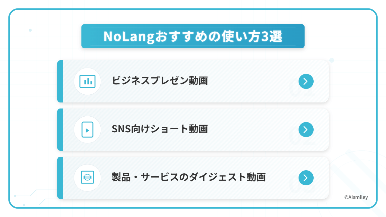 NoLangはその多彩な機能と手軽さから、ビジネス用途から個人の情報発信まで、幅広いシーンで活躍しています。ここでは、特に効果的な3つの活用シーンをご紹介します。