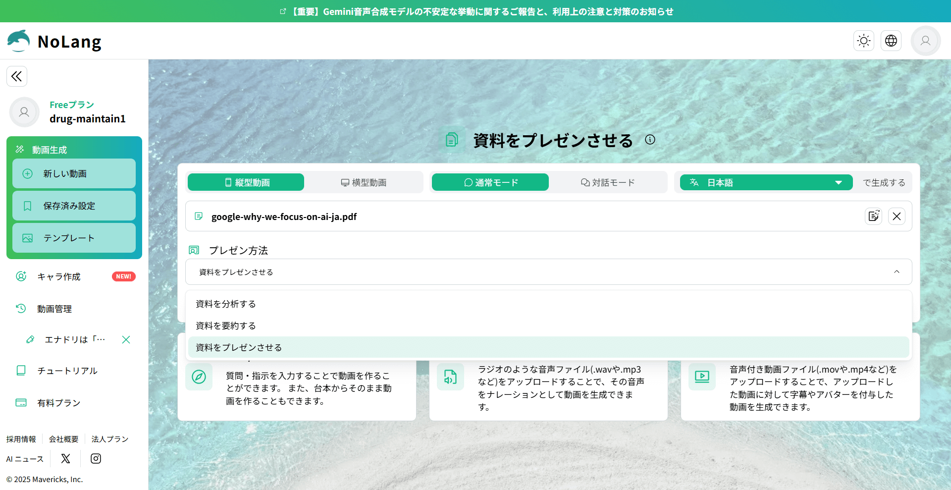 NoLangはプロンプト入力に加え、Webページ、PDF・PPTX資料、音声、動画ファイルなど幅広い入力に対応し、台本作成からテロップ、画像、BGM、ナレーションまでをまとめて生成できます。