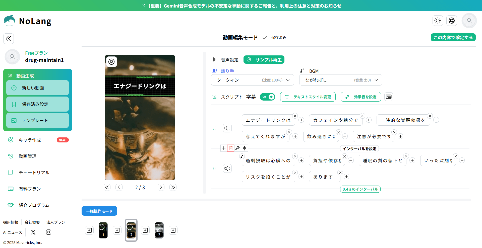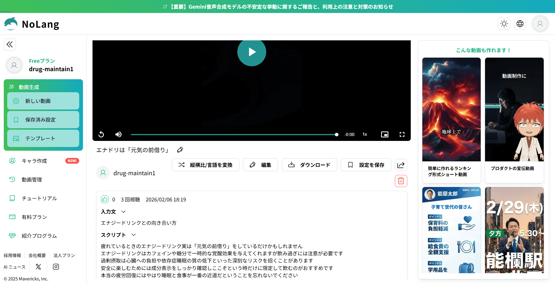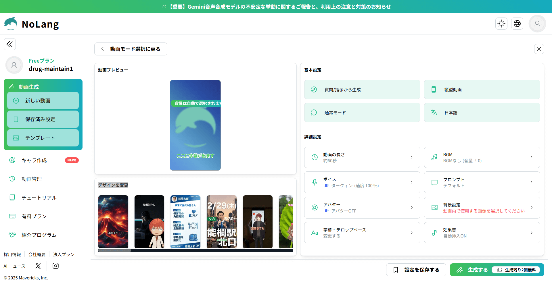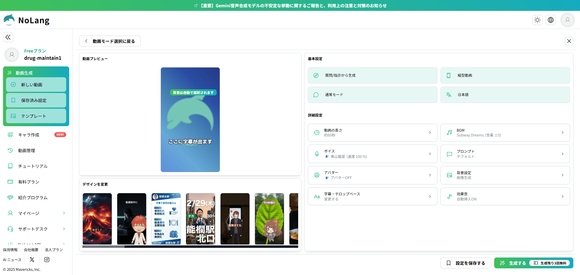 NoLangは、用途に合わせて選べる動画テンプレートが随時追加されています。テンプレートを使うと、画面の案内に沿ってテキストや素材を入れるだけで、構成、字幕、BGM、ナレーションなどが付いた動画を作成しやすくなります。