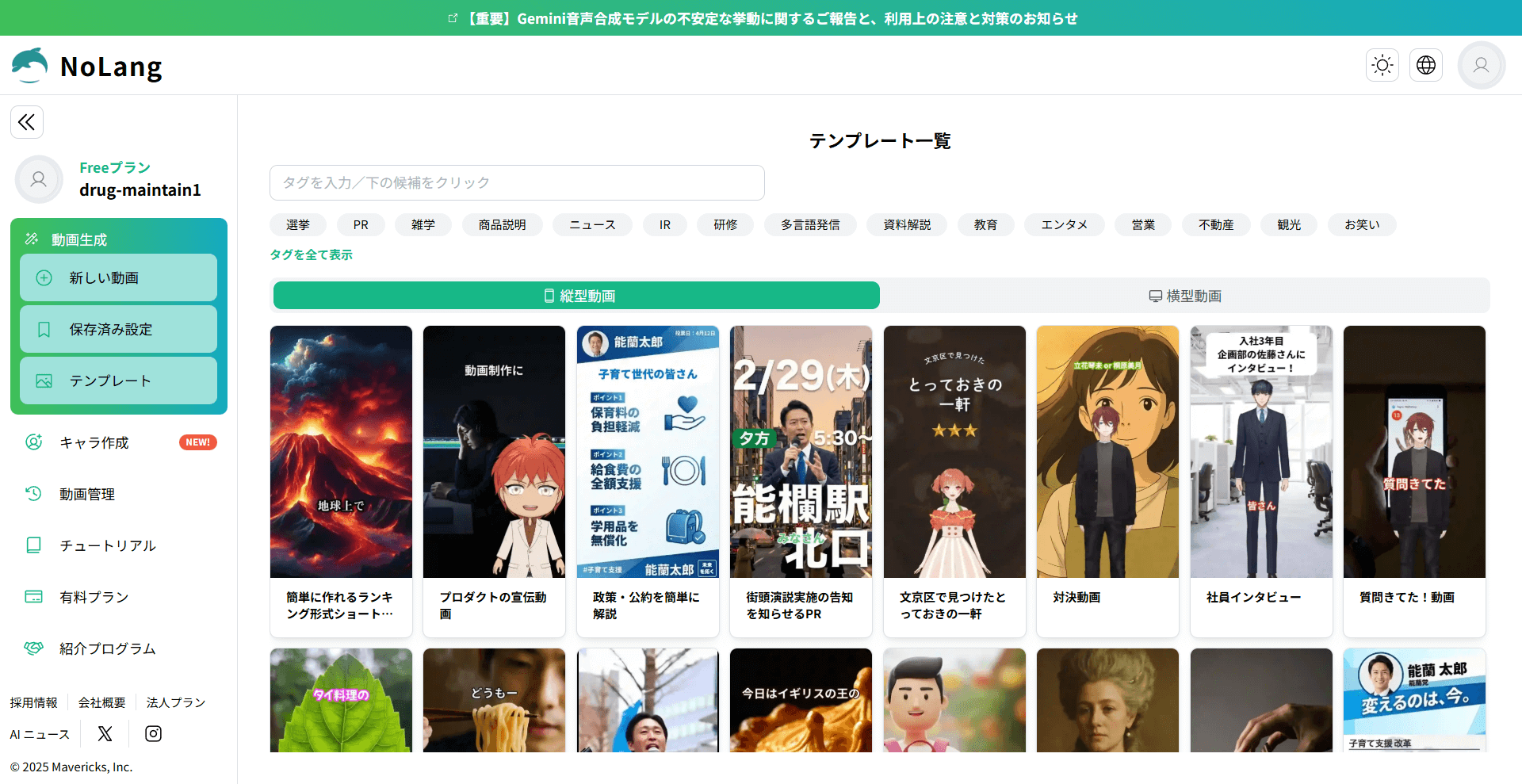 NoLangは、用途に合わせて選べる動画テンプレートが随時追加されています。テンプレートを使うと、画面の案内に沿ってテキストや素材を入れるだけで、構成、字幕、BGM、ナレーションなどが付いた動画を作成しやすくなります。