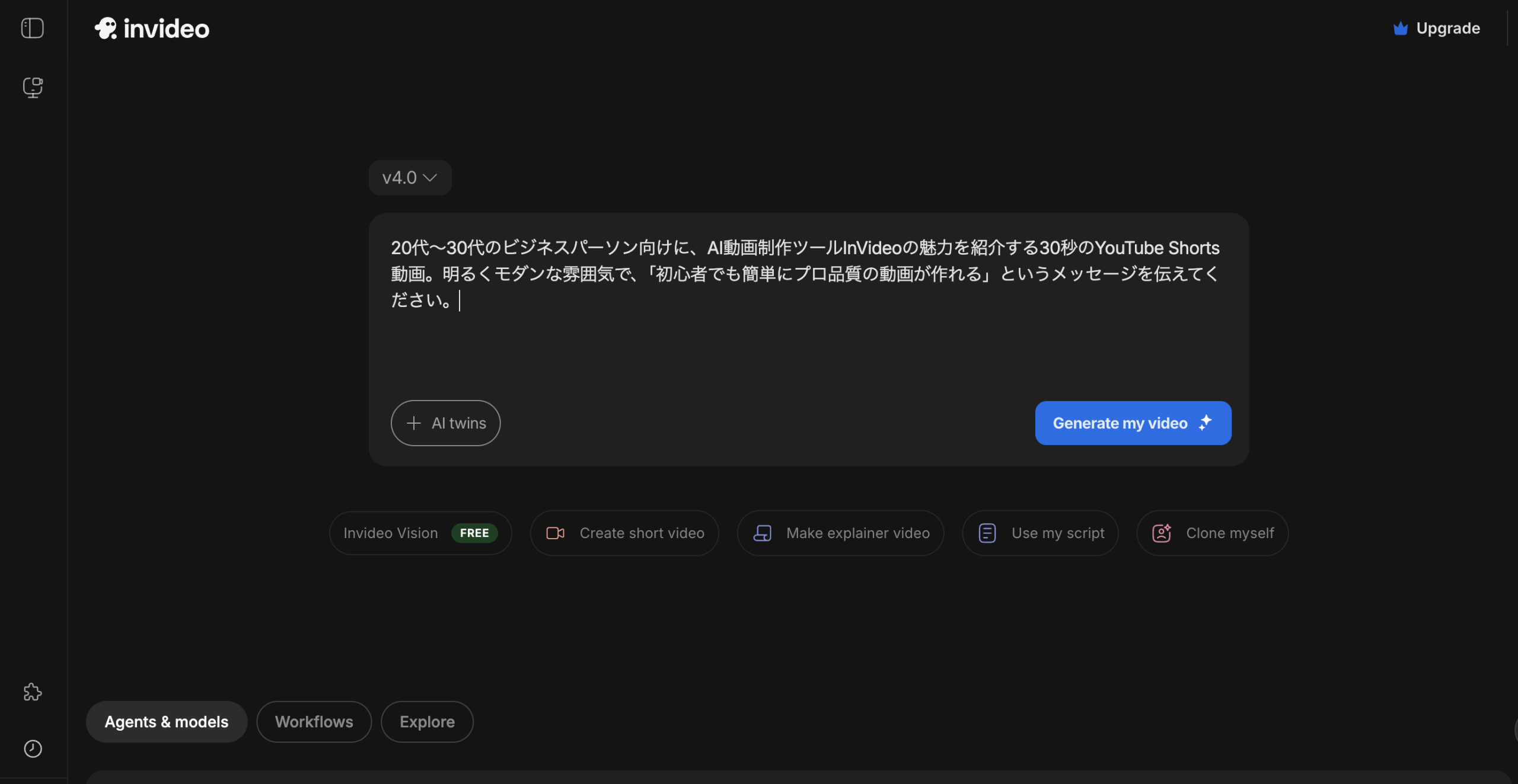 Invideo AI の最大の強みは、テキストプロンプトを入力するだけでAIが自動的にスクリプト・映像・音楽・ナレーションを生成してくれる点です。