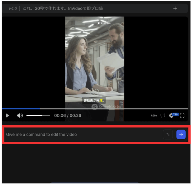 さらに「このシーンを削除」などのチャット形式のテキストコマンドで修正指示を出すことで、簡単に動画の編集が可能です。