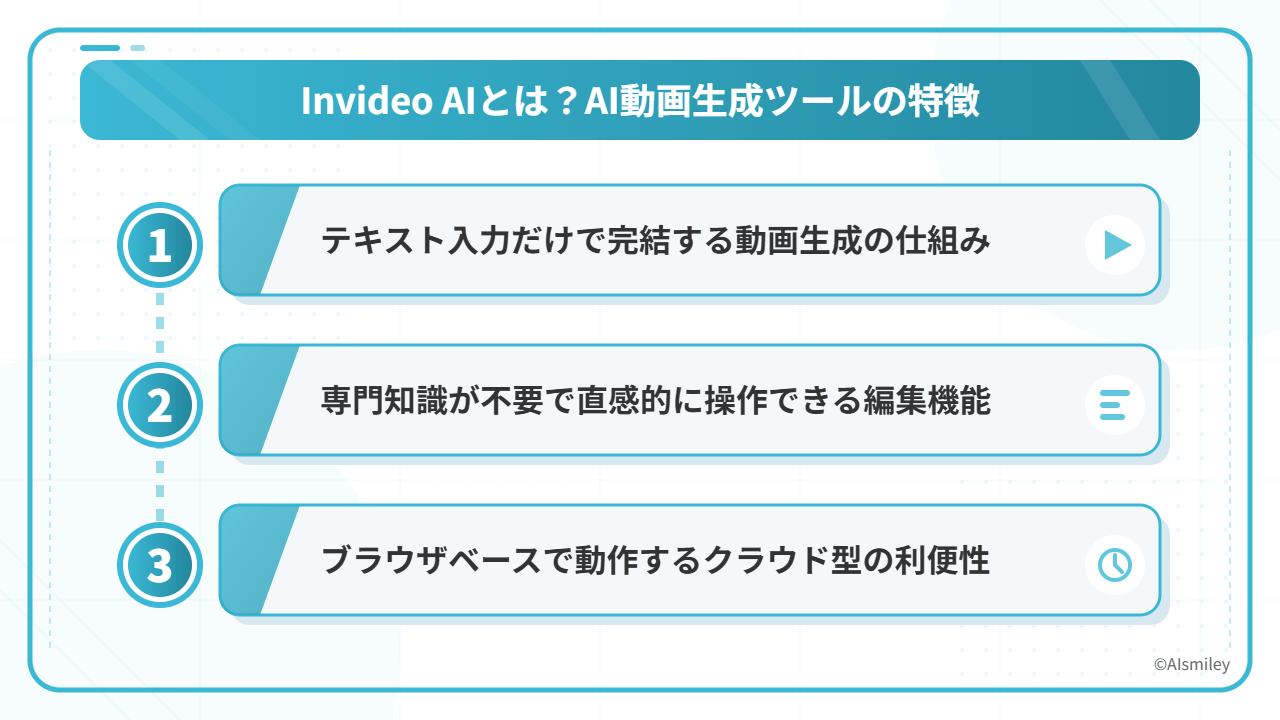 Invideo(インビデオ)AI は、テキスト入力だけでプロ品質の動画を作成できるクラウド型の動画制作サービスです。ブラウザ上で動作するため、高価なソフトのインストールが不要で、初心者でも直感的に操作できます。