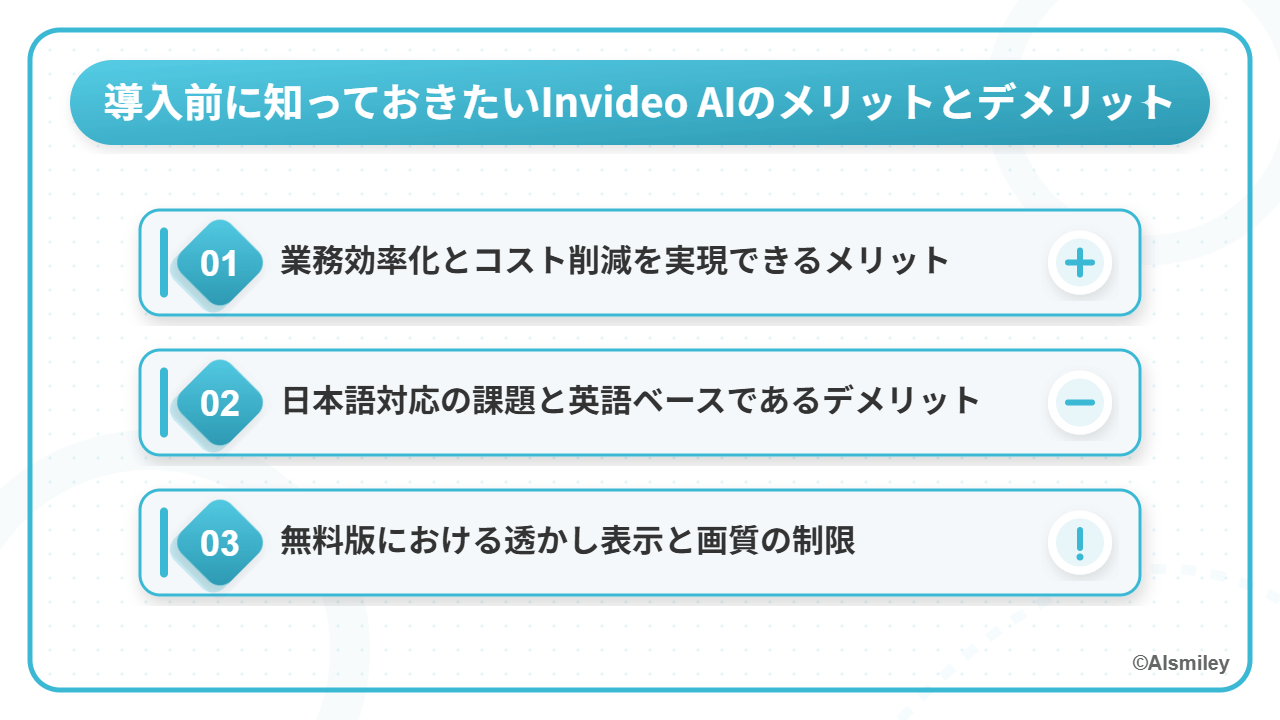Invideo AI を実際に活用する際には、メリットとデメリットの両面を理解しておく必要があります。導入することで得られる効果と、事前に把握しておくべき注意点を解説します。