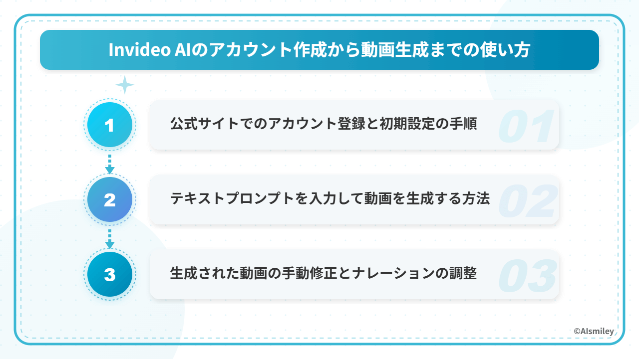 Invideo AI を利用するための具体的なステップを、登録から出力まで時系列で解説します。基本的な流れは以下のステップです。
