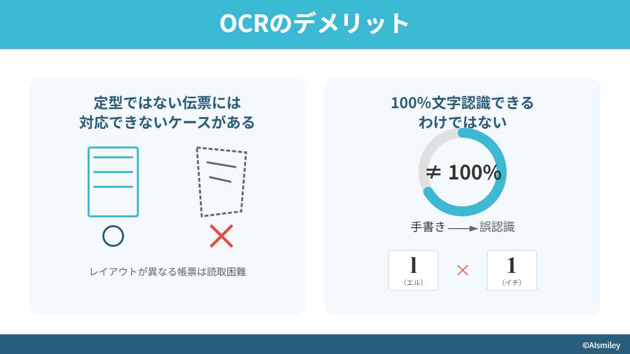 もともとOCRは、決められたレイアウトの伝票や通帳に書かれている文字を認識することが目的でした。そのため、レイアウトが変更されると、文字を認識できなくなる可能性があるのです。