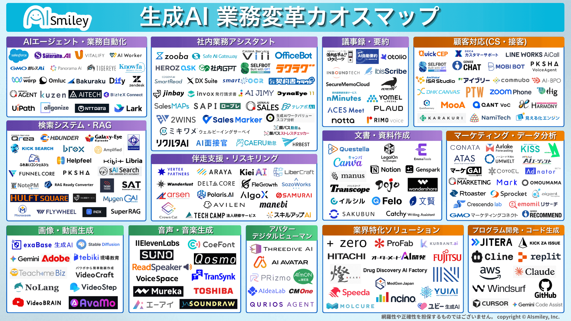 その他、「AIエージェント」や「予測AI」「チャットボット」「バックオフィス向け」など様々なカオスマップもご案内できますので、詳しくは当社ブース「AI・業務自動化 展:E31-6」へお立ち寄りください。