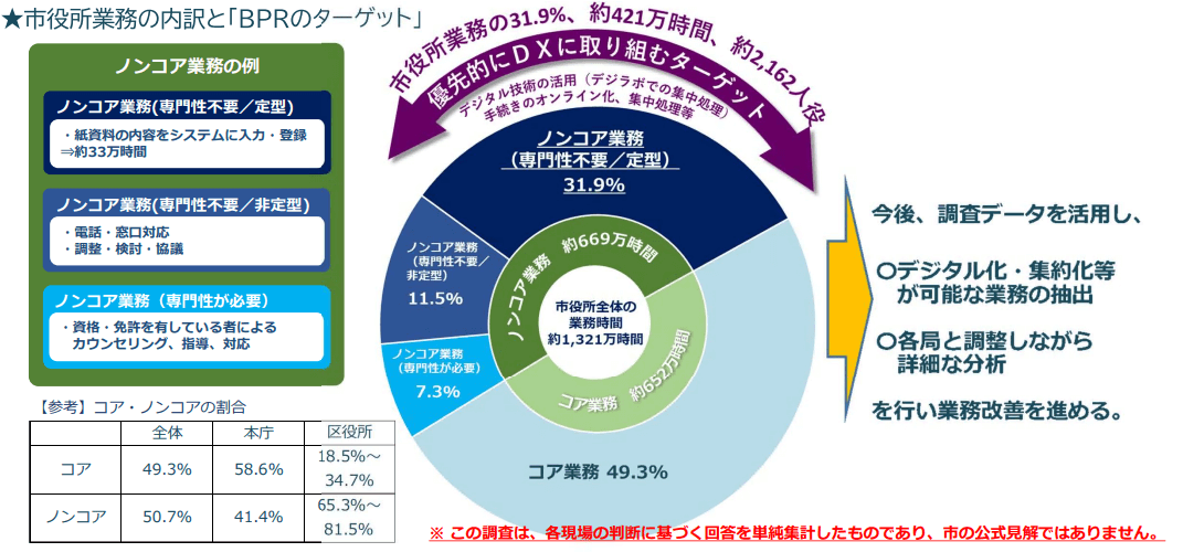 令和3年度に実施された全庁的な業務量調査では、多くの職員が専門性を必要としない定型的なノンコア業務に年間421万時間、市役所業務全体の31.9%にもなる膨大な時間を費やしている実態が明らかになりました。