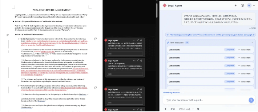 Legal Agentは、法務業務に特化したWordアドイン型AI「Legal Agent」の提供を開始しました。Word上で契約書の修正やドラフト作成、コメント対応などをリアルタイムで支援します。