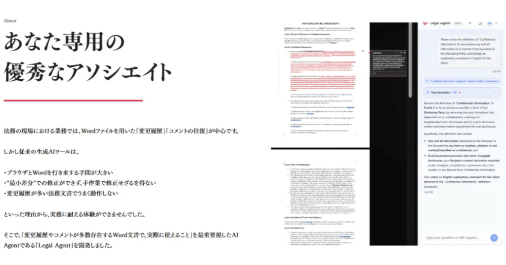 Legal Agentは、法務業務に特化したWordアドイン型AI「Legal Agent」の提供を開始しました。Word上で契約書の修正やドラフト作成、コメント対応などをリアルタイムで支援します。