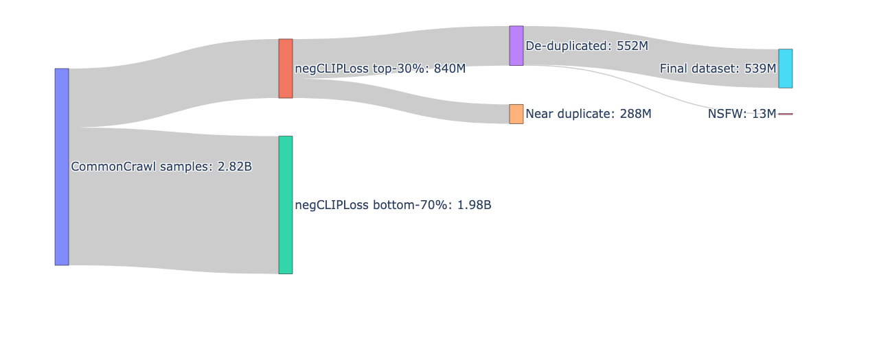 また、画像とテキストが無関係なデータを除去するため、従来のCLIP-scoreに代わりnegCLIPLossという新しい指標を採用し、最終的には5.4億件の高品質な画像・テキストペアを学習データとして使用しています。
