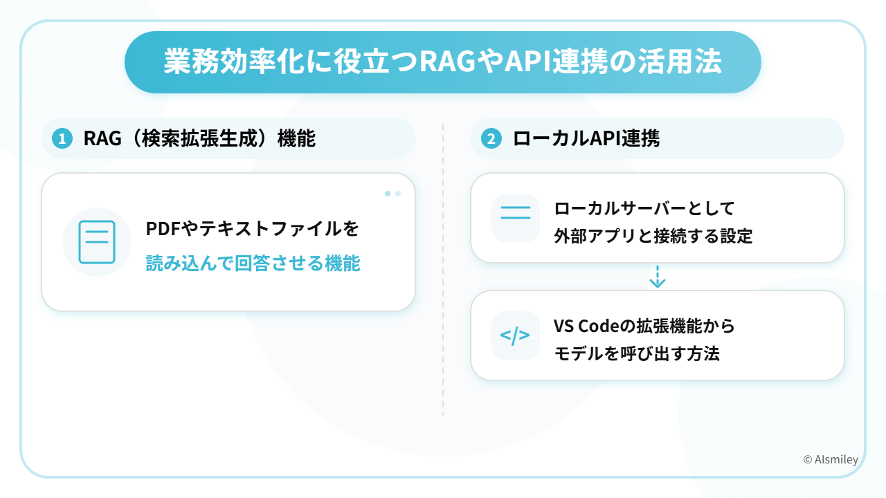 LM Studioの真価は、単なるチャットボットとしての利用にとどまらず、実務プロセスに組み込んで業務効率を飛躍的に高める拡張機能にあります。