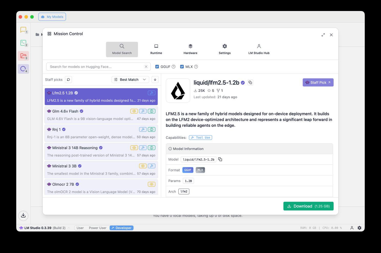 コマンドラインの知識がなくても、マウス操作だけでモデルの検索からダウンロード、起動までをすべて完結できるため、技術的なバックグラウンドを持たないユーザーでも簡単に利用できます。