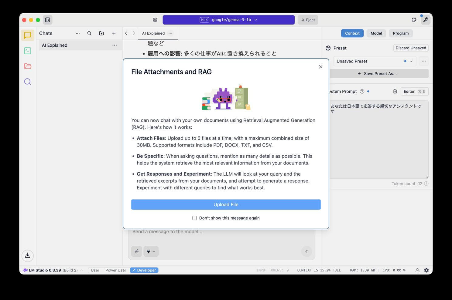 LM Studioには、業務効率化に大きく貢献するRAG(検索拡張生成)機能が搭載されています。