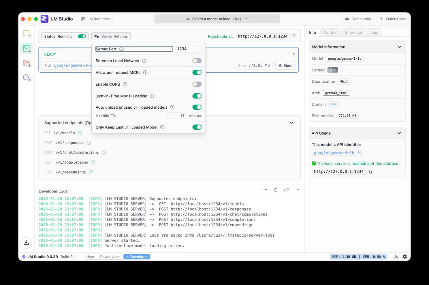 デフォルトでは、サーバーは「http://localhost:1234/v1」のエンドポイントで利用可能になります。