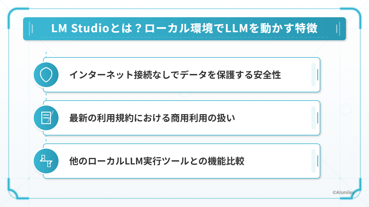 LM Studioの最大の特長は、完全にローカル環境で動作する点にあります。