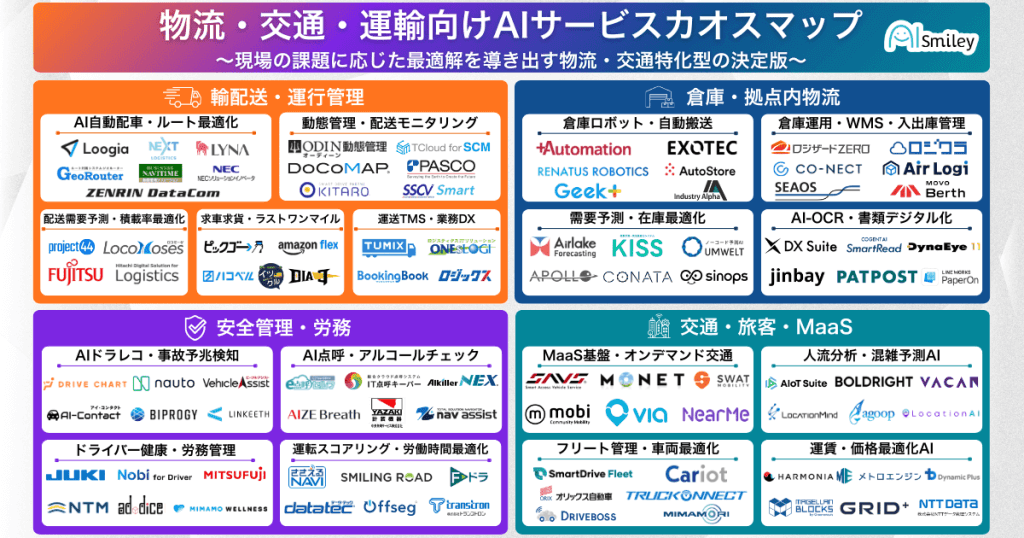 そこでAIsmileyでは、現場の課題解決に直結する物流・交通・運輸業界向けAIサービス90製品以上を厳選。大きく4つのカテゴリに分類し、2026年問題への対策や導入検討をスムーズに進めるためのカオスマップとして整理いたしました。