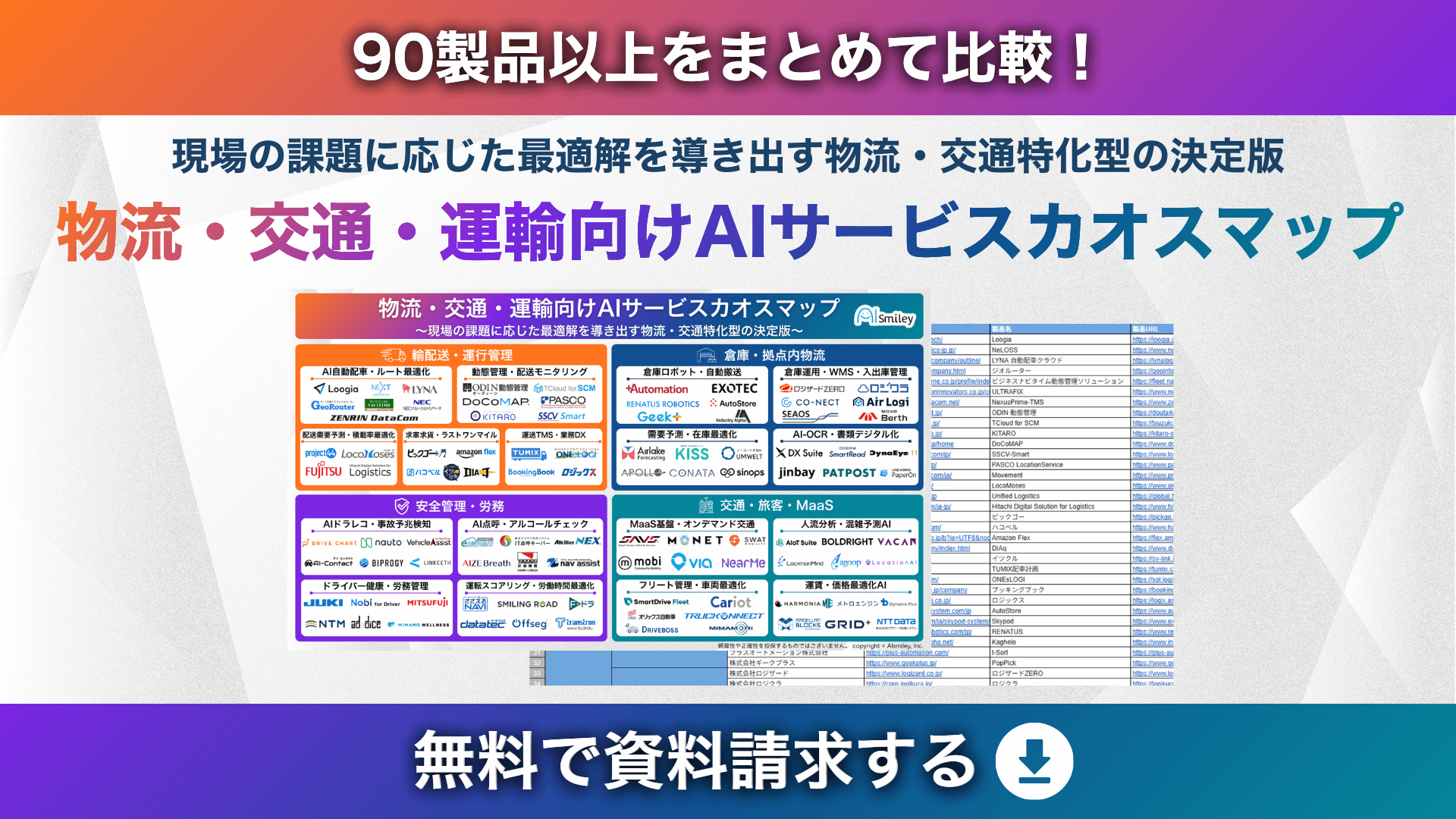 国内最大級のAIポータルメディア「AIsmiley」を運営する株式会社アイスマイリーは、現場の課題に応じた最適解を導き出す物流・交通特化型の決定版「物流・交通・運輸向けAIサービスカオスマップ」を、2026年3月10日(火)に公開しました。掲載総数は90製品以上です。​
