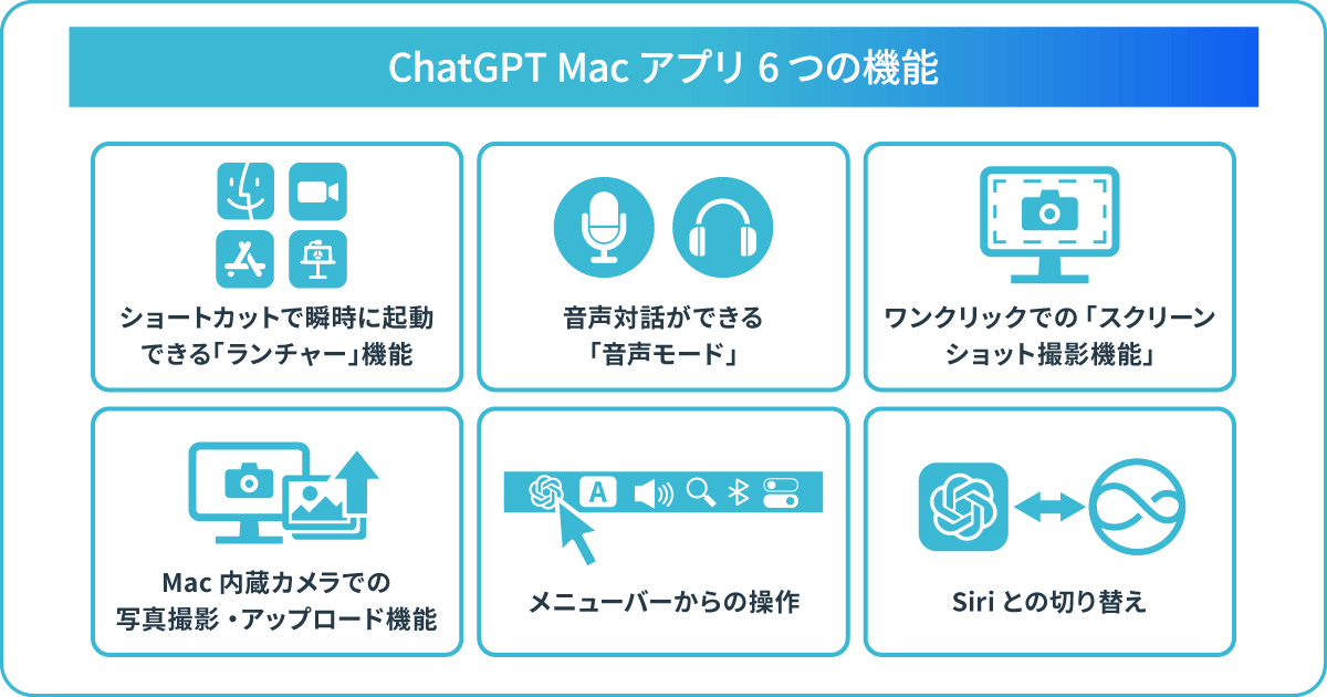 ChatGPTのMac版アプリは、Mac環境に最適化されており、Web版にはない独自機能を数多く搭載しています。ここでは、Mac版アプリならではの主要機能を詳しく解説します。