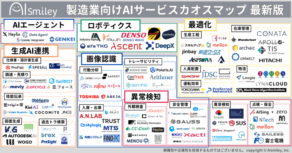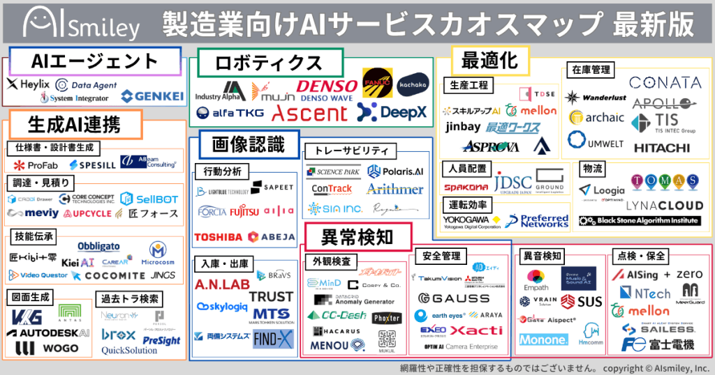 AIポータルメディア「AIsmiley」を運営する株式会社アイスマイリーは、製造業におけるAI活用の最新動向を整理した「製造業向けAIカオスマップ」を、2025年5月7日に公開しました。掲載総数は110製品以上です。