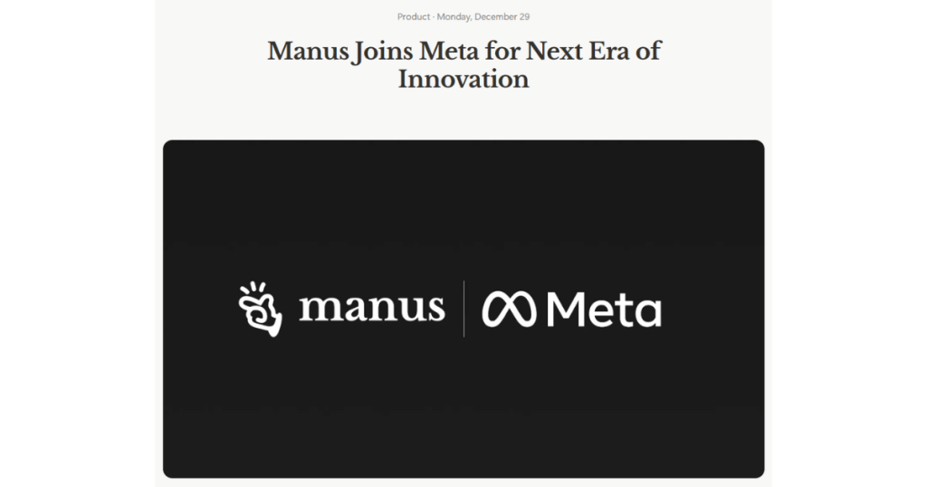 Manusは、2025年12月29日に米Meta社と協力関係を締結したことを発表しました。