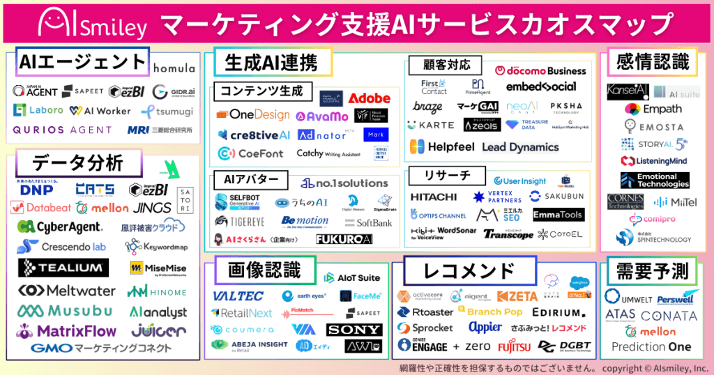 近年では、マルチモーダルな感情認識や、AIエージェントを活用した業務支援も一般化しつつあります。これら急速に進化するAIソリューションを7カテゴリーで整理した「マーケティング支援AIサービスカオスマップ」をこの度作成いたしました。