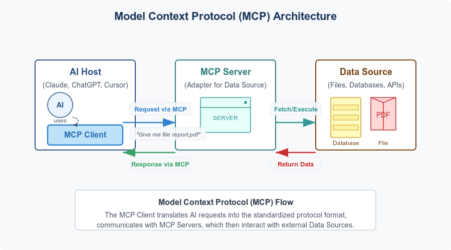 MCPは共通規格を提供し、どのAIプラットフォームからでも同じ方法でツールやデータソースに接続できます。一度MCPサーバーを構築すれば、ClaudeChatGPTGeminiなど、異なるAIプラットフォームで再利用可能です。