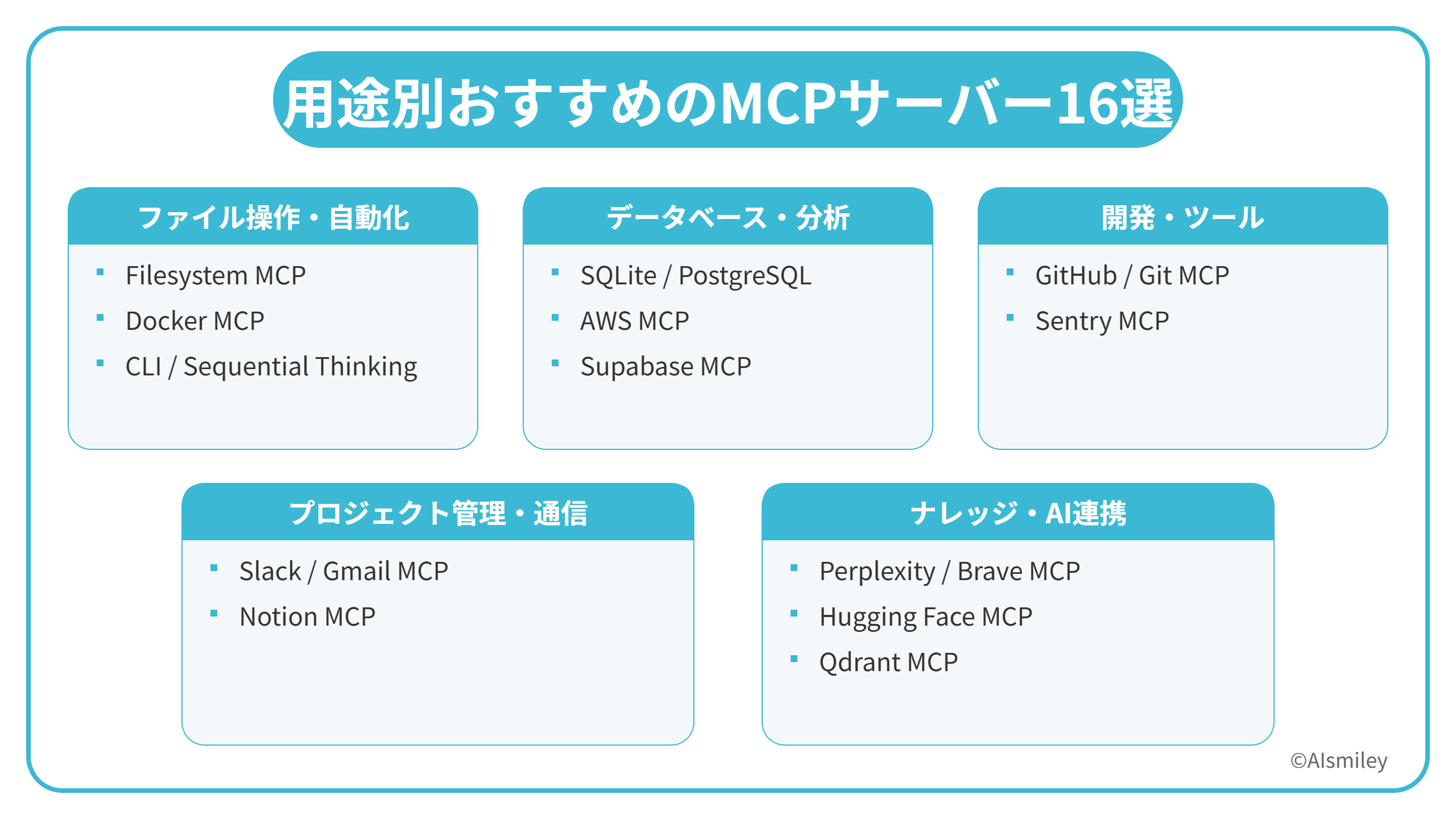 MCPサーバーはさまざまな種類があるため、目的や用途に応じて選択しましょう。