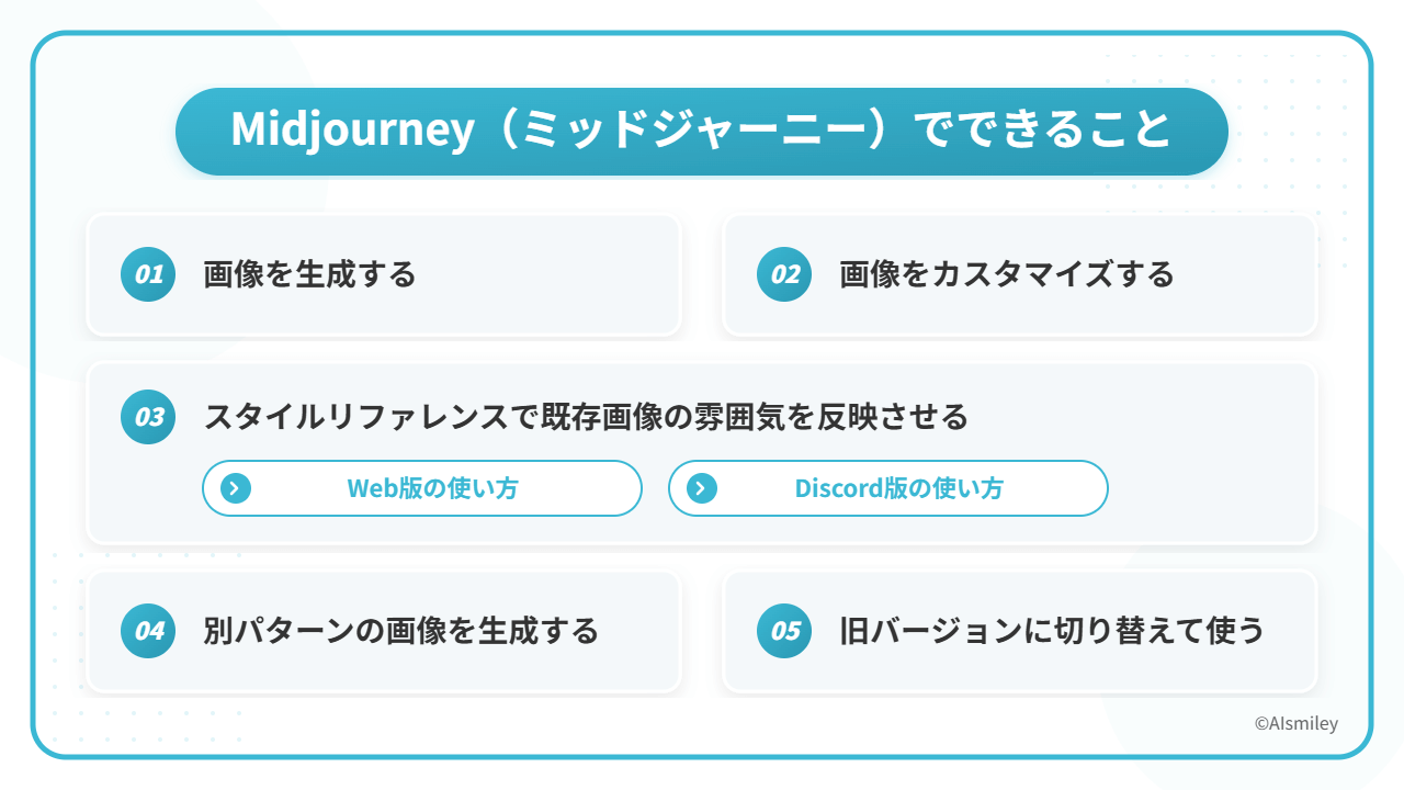 Midjourneyでできることを5つ、使い方も含めてご紹介します。