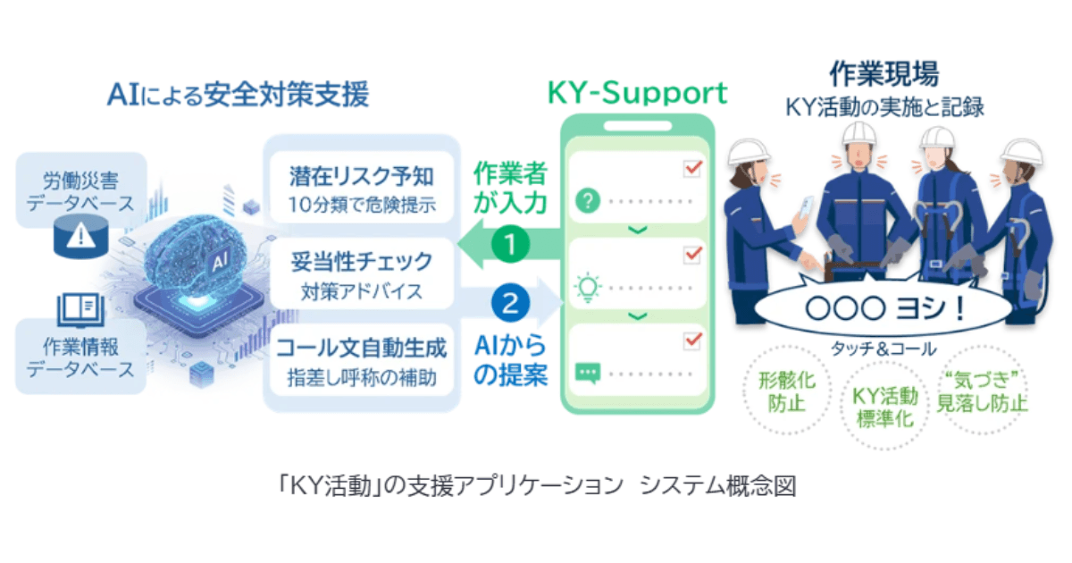 そこで同社は、誰もが質の高いKY活動を実施できる仕組みの構築を目的に、個人の経験や知識に依存せず、各種作業のデータや過去の労働災害事例を活用するAIを搭載したアプリケーションを開発し、2026年4月から順次全社へ導入します。