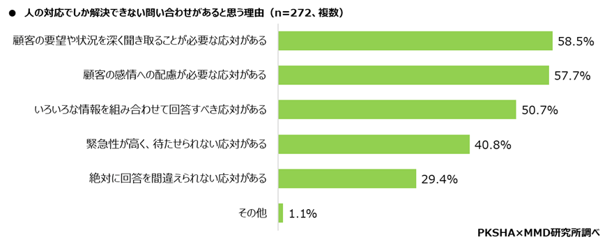 その中でも人の対応でしか解決できない問い合わせがあると回答した272人を対象に、その理由を聞いたところ「顧客の要望や状況を深く聞き取ることが必要な応対がある」が58.5%と最も多く、次に「顧客の感情への配慮が必要な応対がある」が57.7%、「いろいろな情報を組み合わせて回答すべき応対がある」が50.7%となりました。
