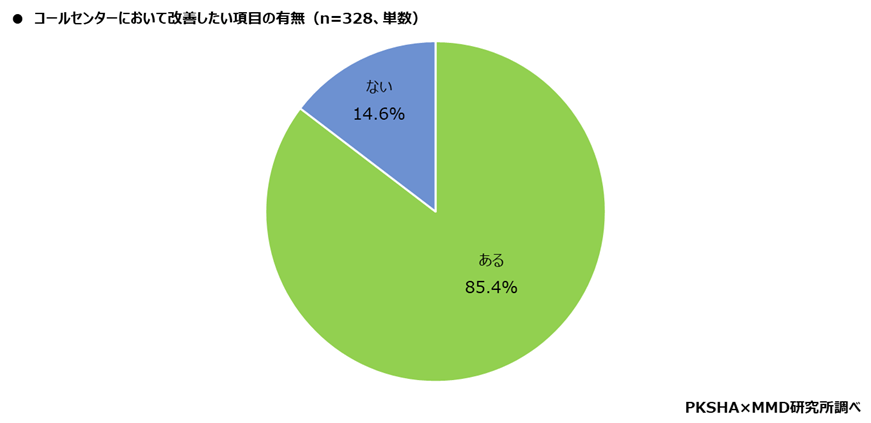 コールセンターにおいて改善したい項目があるかという質問に対しては「ある」が85.4%、「ない」が14.6%と回答。