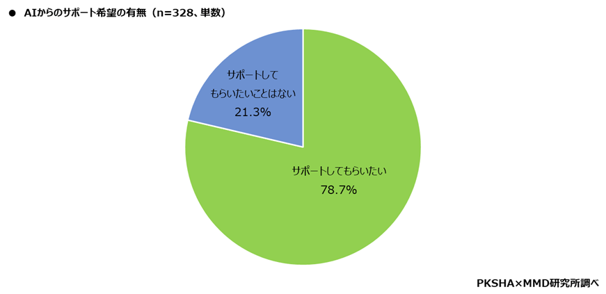 有人対応の際にAIにサポートしてもらいたいことがあるかという質問に対しては、「サポートしてもらいたい」が78.7%、「サポートしてもらいたいことはない」が21.3%となりました。