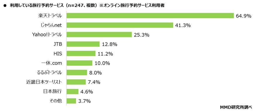 18歳~69歳の男女1,000人のうち、オンライン旅行予約サービス利用者247人に、利用しているサービス(複数回答可)を聞くと、「楽天トラベル」が64.9%と最も多く、次に「じゃらんnet」が41.3%、「Yahoo!トラベル」が25.3%でした。