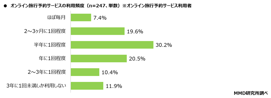 また、オンライン旅行予約サービスの利用頻度の回答結果では、「半年に1回程度」が30.2%と最も多く、次に「年に1回程度」が20.5%、「2~3ヶ月に1回程度」が19.6%になります。