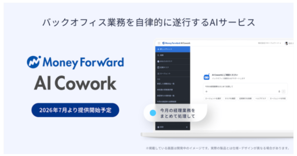 • マネーフォワードが「マネーフォワード AI Cowork」を2026年7月より提供開始。AIがユーザーの同僚(Coworker)として、バックオフィス業務を自律的に処理