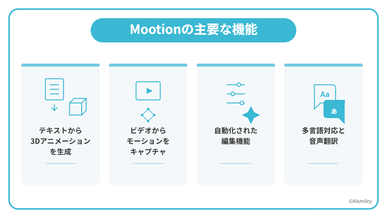 | Mootion | テキスト・動画から3Dアニメーションを自動生成 | 3Dキャラクターアニメーション、多様な入力形式、多言語対応 |