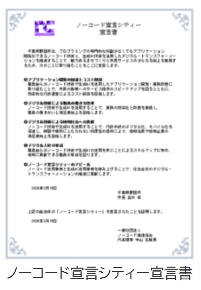 本宣言は、ノーコード推進協会(NCPA)が実施する「ノーコード宣言シティープログラム」に基づく同プログラム史上初の宣言です。これにより、アプリケーション開発の加速やコスト削減、デジタル技術による職員の働き方改革の推進に取り組みます。