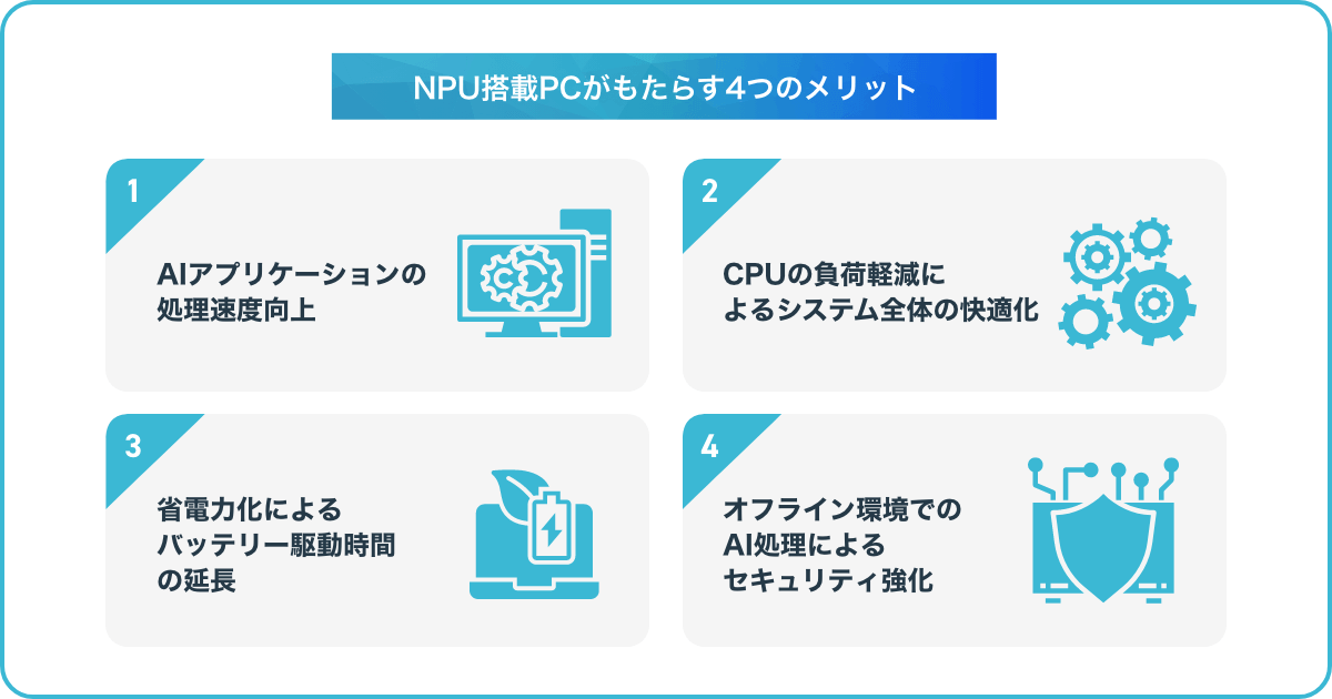 ここでは、NPU搭載PCがもたらす主な4つのメリットについて見ていきましょう。