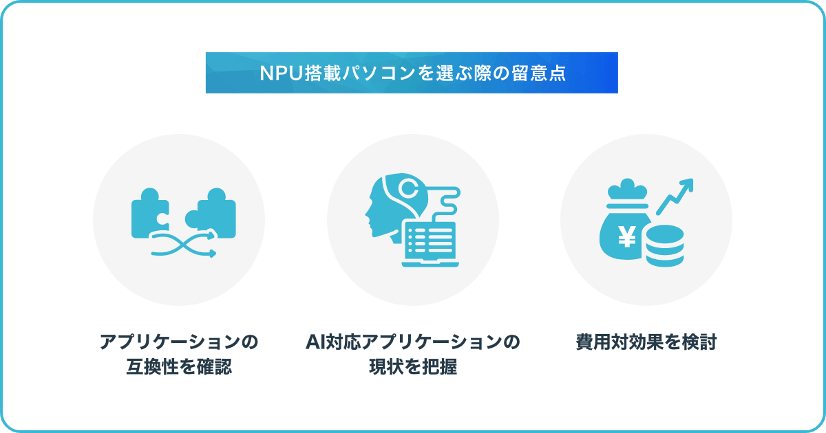 ここでは、NPU搭載パソコンを選ぶ際に確認しておきたい3つの留意点について解説します。