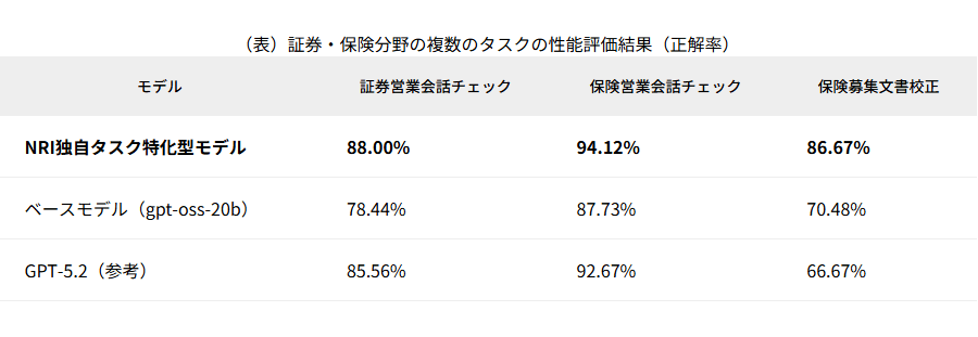 証券・保険の複数の実務を題材にした検証の結果、いずれの業務においてもNRIの特化型モデルが商用大規模モデル「GPT-5.2」を上回りました。