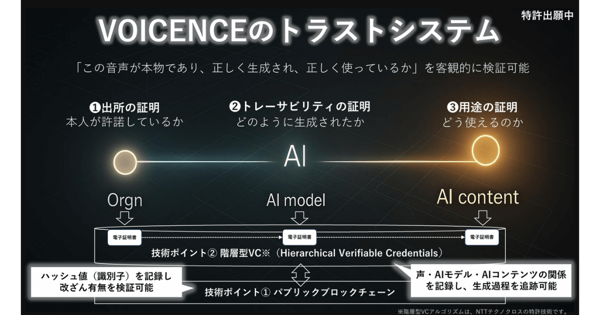 「VOICENCE」にて保管・管理される「音声IP」には、真正性を証明するデータが付与されており、「無断生成された音声データと区別できることが特徴」です。