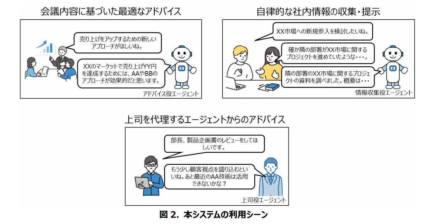 会話の文脈を読み、人間が支援を必要とする最適なタイミングで発言するなど、EQ(自身や周囲の感情を適切に察知・コントロールする能力)の観点を取り入れた、さまざまな役割を持つAIエージェントが会議に参加します。