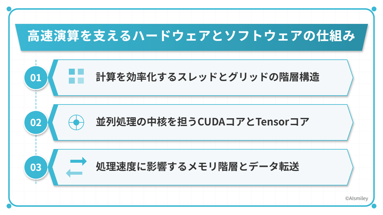 CUDA技術の中核となるのは、以下の3つの要素です。