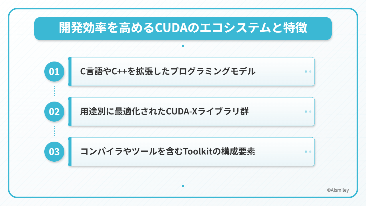 CUDAが多くの開発者から高い支持を得ている理由は、そのエコシステムの充実度にあります。