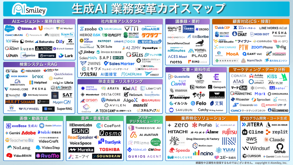 その他「バックオフィス向け」や「チャットボット」「予測AI」など様々なカオスマップもご案内できますので、詳しくは当社ブース「小間番号:W1-44(AI活用支援EXPO)」へお立ち寄りください。